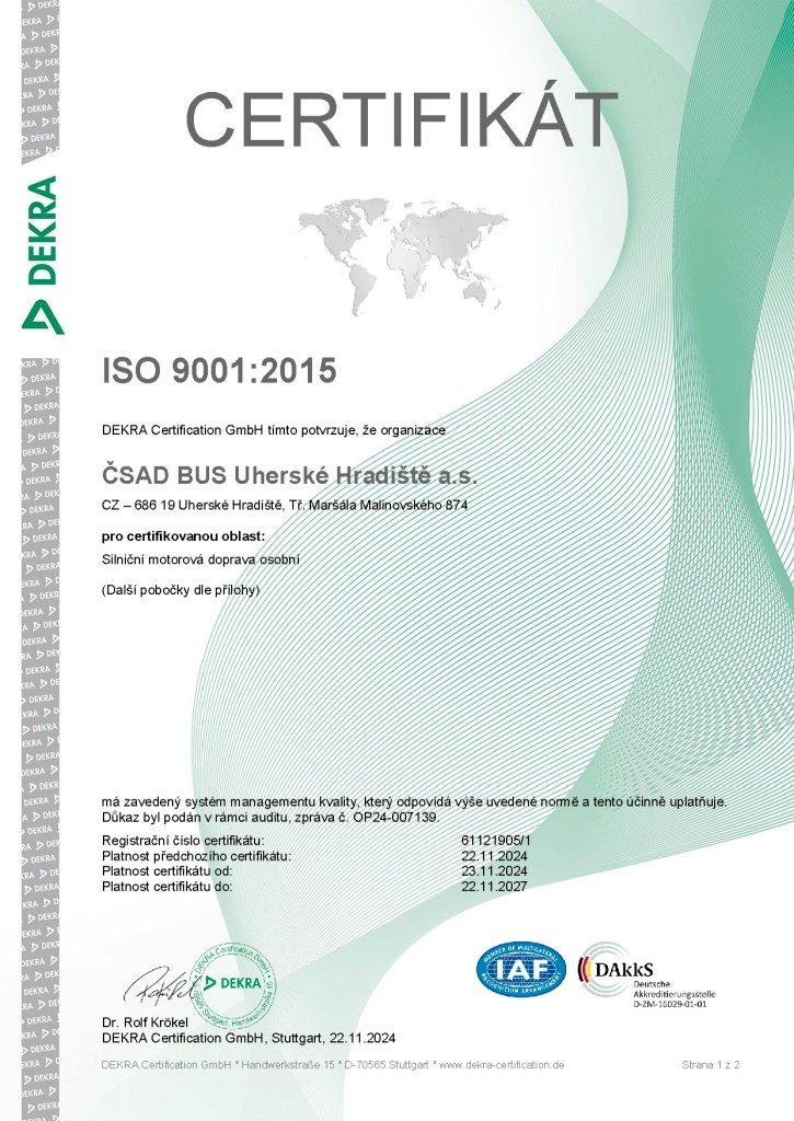 • Certifikát ISO 9001:2015 ČSAD BUS Uherské Hradiště a.s. (Stáhnout)